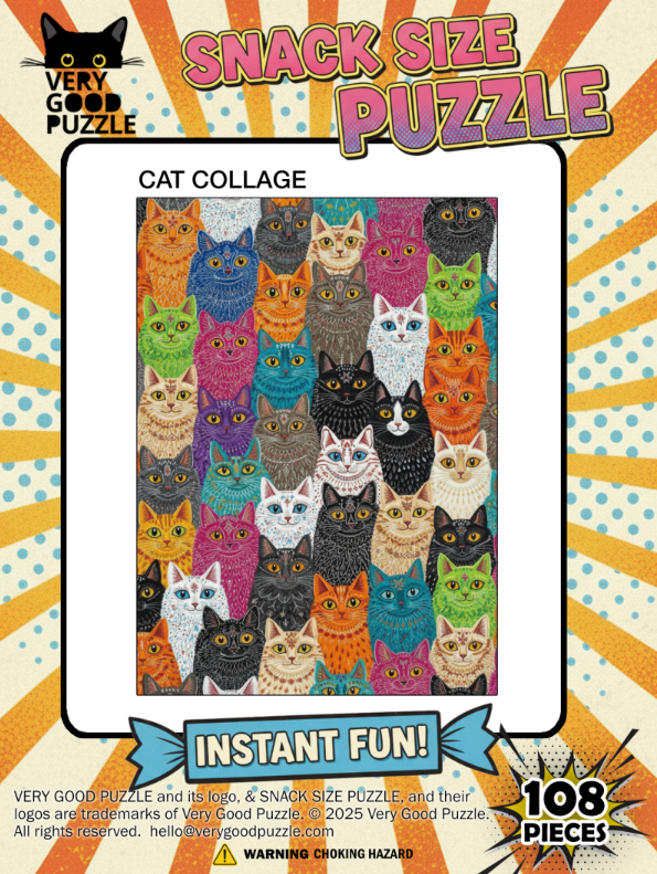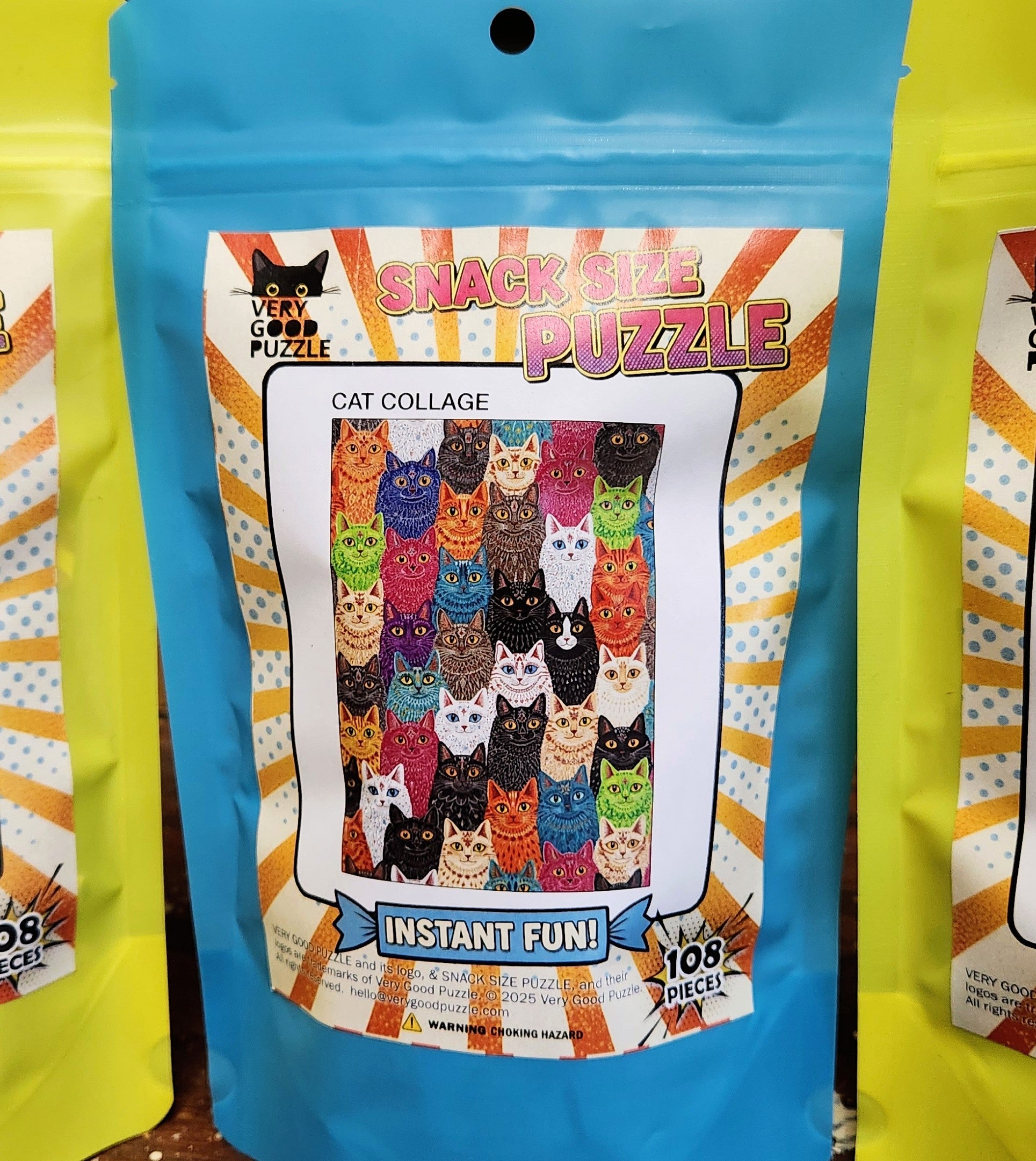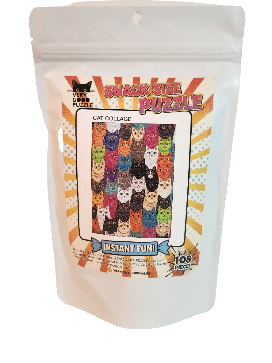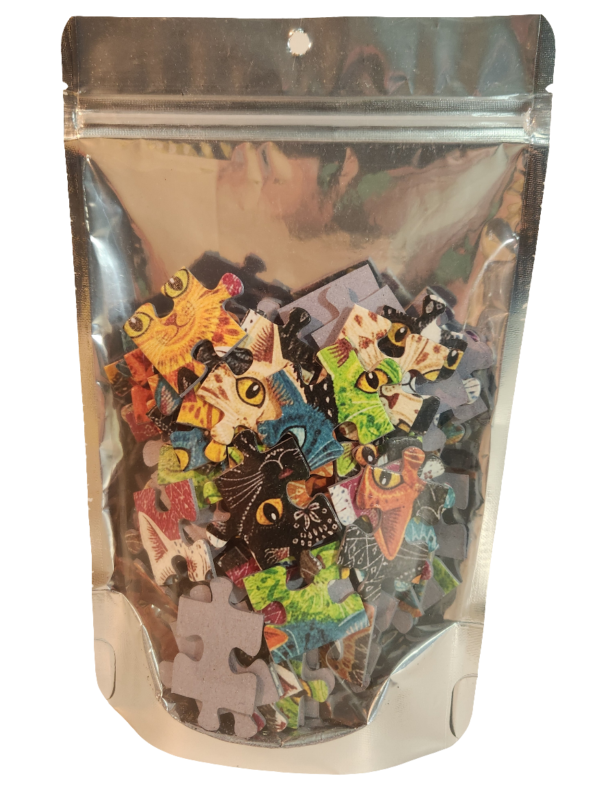 • 108 Piece Jigsaw Puzzle in 6" x 9" colorful stand up pouch with hang hole