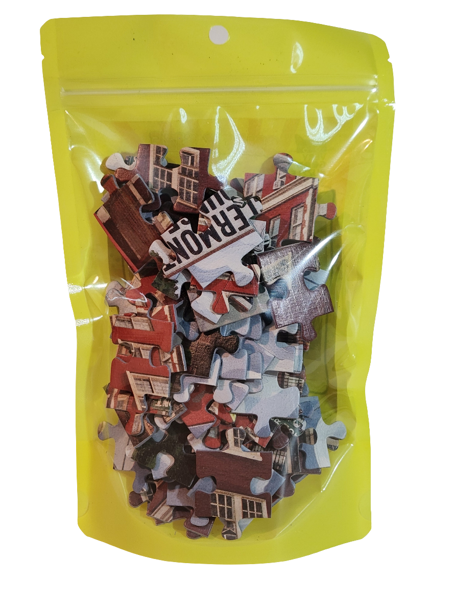 • 108 Piece Jigsaw Puzzle in 6" x 9" colorful stand up pouch with hang hole