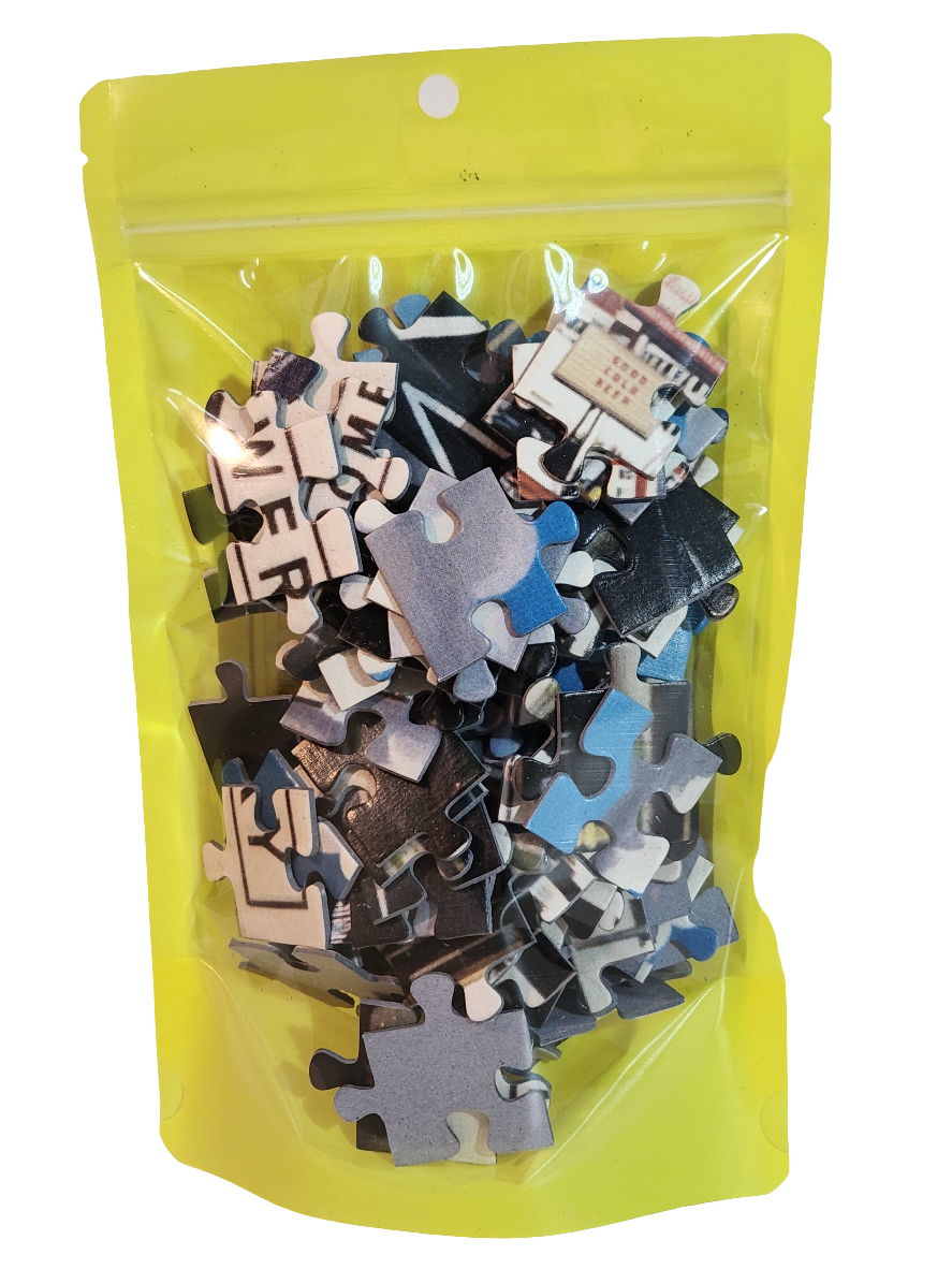 • 108 Piece Jigsaw Puzzle in 6" x 9" colorful stand up pouch with hang hole