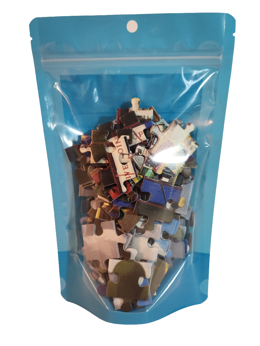 • 108 Piece Jigsaw Puzzle in 6" x 9" colorful stand up pouch with hang hole