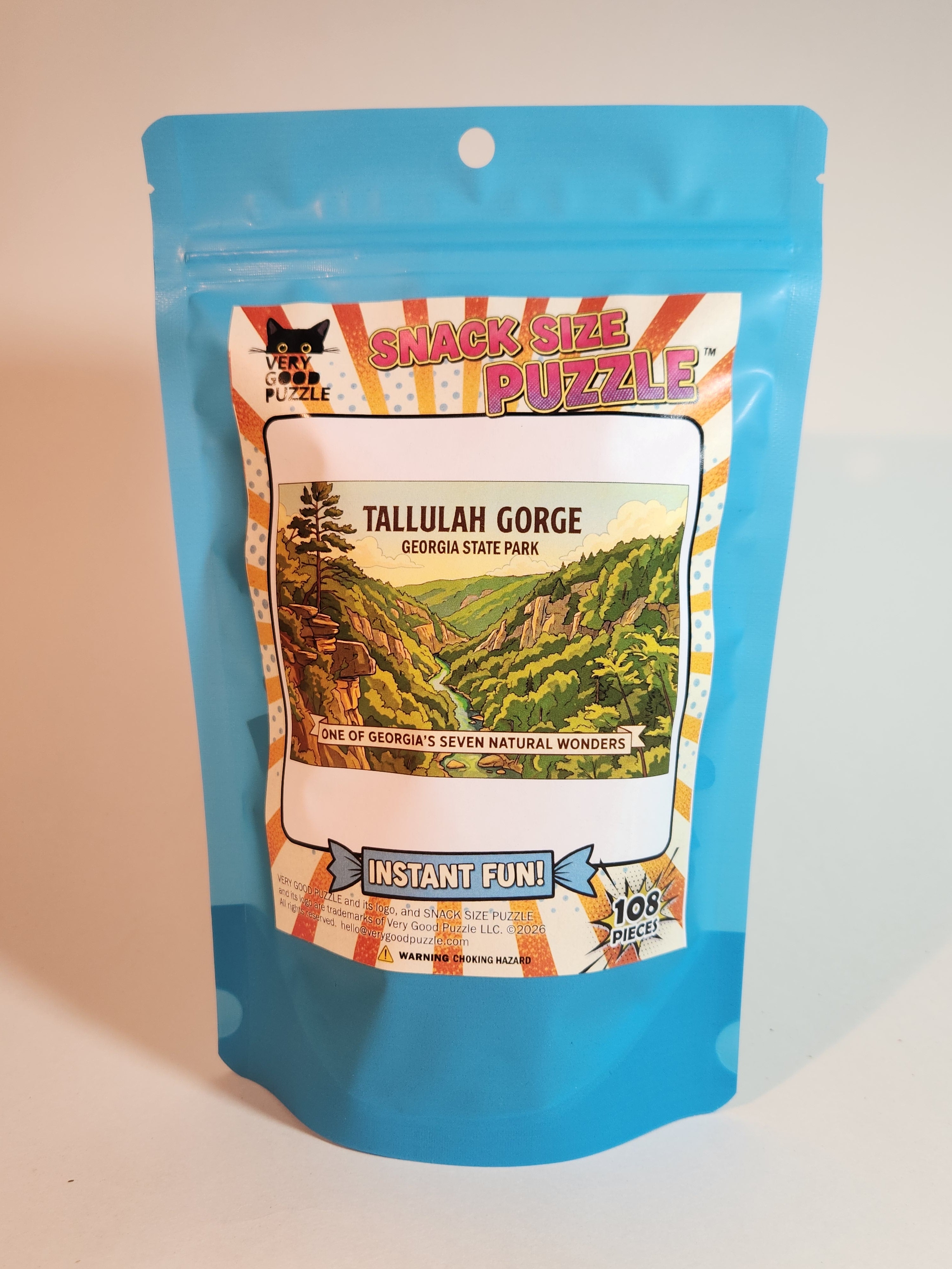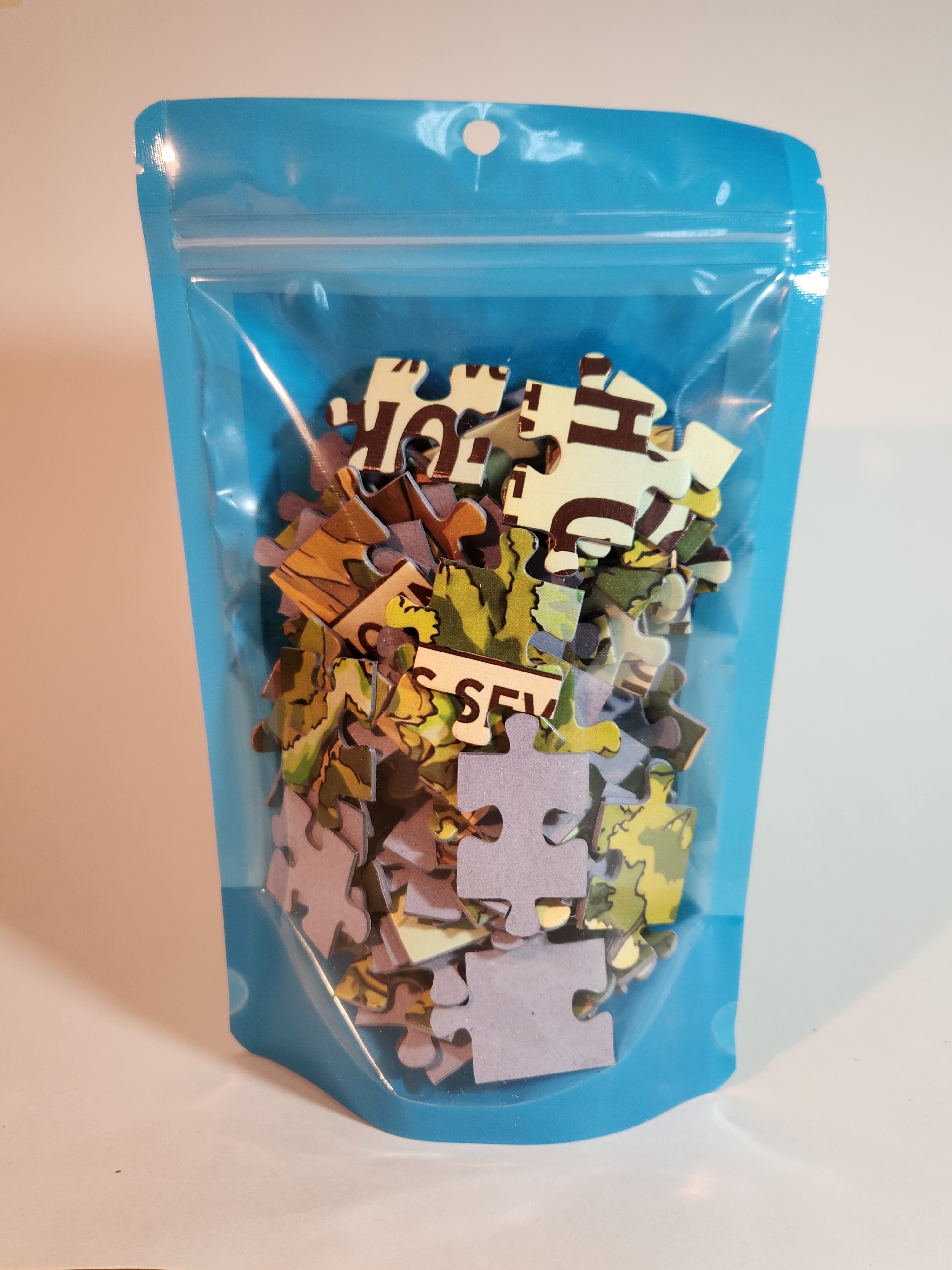 • 108 Piece Jigsaw Puzzle in 6" x 9" colorful stand up pouch with hang hole